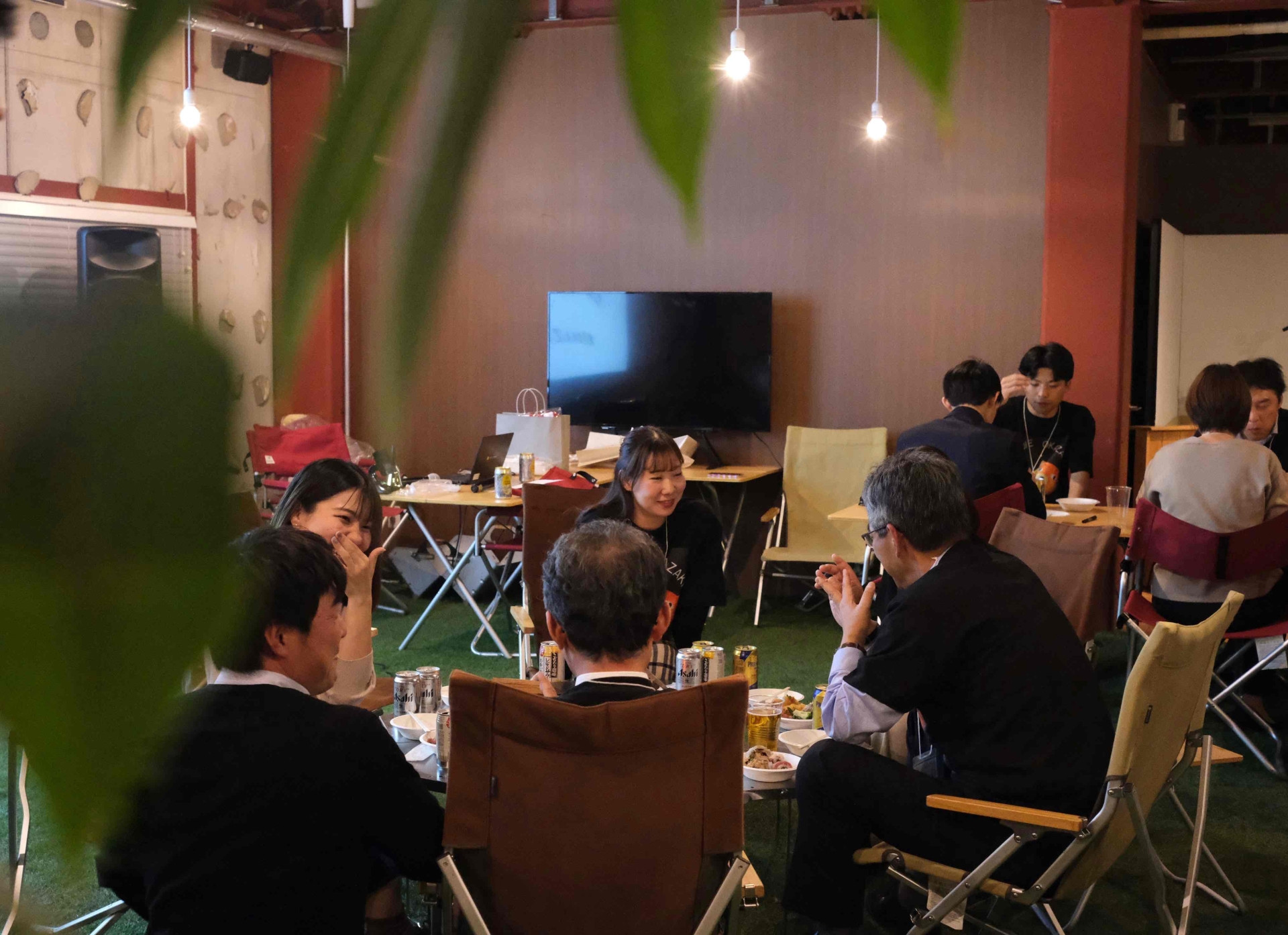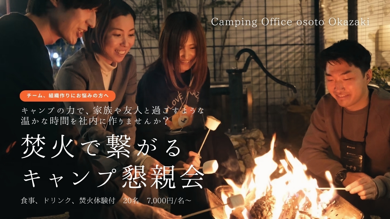 Camping Office osoto Okazaki (以下、osoto Okazaki)で、懇親会プランをご利用いただいたのは、岡崎市に営業本部をもつエネルギー小売事業の企業様です。コロナ禍が明け、3年ぶりに岡崎営業本部の忘年会を開催するにあたり、これまでのようにホテルや居酒屋に集まるのではなく、もっと手づくり感のある忘年会がしたいという想いからご相談をいただきました。